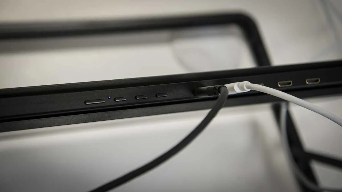安装完成后,您可以通过多种方式将其连接到电脑。它配备一个 USB Type-C 接口和三个 HDMI 接口,可连接多个设备。因此,您不仅可以扩展显示器显示,还可以根据需要连接到多台设备。如果您在团队中工作,需要共享显示器时,这一切都非常方便。使用中央显示器底座下方的按钮,可以快速访问输入选择以及所有显示器显示设置。