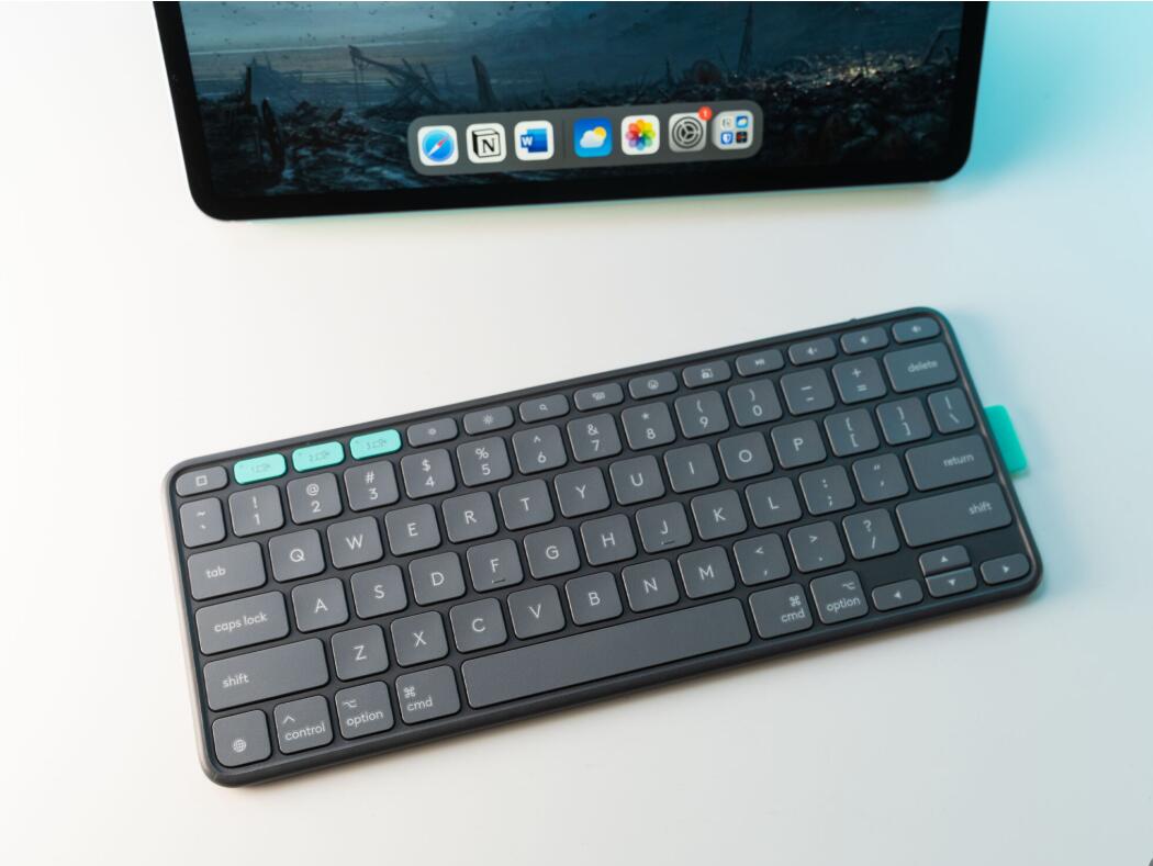 此外,无线键盘进一步提升了多功能性。由于它不固定在保护套上,用户可以自由地将键盘放置在最舒适的位置。这款键盘还支持连接多台设备——罗技曾提出过一个案例,可以旋转 iPad,将 iPhone 放在保护套旁边,然后同时在两台设备上使用键盘。这个想法很有意思,但在我使用 Flip Folio 的过程中,我发现它并不实用。
