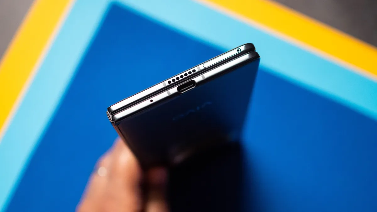 底部刚好够容纳 USB-C 接口,这几乎成了 4.3 毫米设计的瓶颈。去年推出的折叠屏手机最棒的功能之一是在盖子和内面板内嵌入了传统的超声波传感器,但 X Fold 5 却没有这个功能——它只能使用所有折叠屏手机上常见的侧装式读取器。